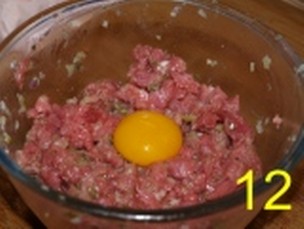 unite quindi i cipollotti, l'aglio, la cipolla e i cetriolini tritati (10). Mescolate gli ingredienti (11) e unite al composto il tuorlo d'uovo (12), amalgamate il tutto e dividetelo nei piatti aiutandovi con uno stampo. Affettate sopra alla carne il tartufo e terminate aggiungendo un ulteriore filo d'olio tartufato. Servite subito.