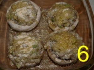 Sfumate con l’acqua, salate e pepate. Lasciate cuocere per 4-5 minuti e aggiungete l’orzo (4). Fate rapprendere il tutto e toglietelo dal fuoco per farlo raffreddare. Mettete su un piano le cappelle dei funghi con un filo d’olio e il sale (5). Riempite con il ripieno raffreddato e spolverizzate con il pan grattato (6), mettere in forno la pirofila con un filo d’olio e cuocete a 220° in forno statico per 8 minuti, poi passarli al grill fino a che si saranno colorati c.a. 5 minuti.
