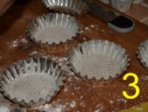 Stendete su una spianatoia la pasta frolla con uno spessore di 5 mm (1). Spennellate con del burro fuso degli stampini e infarinateli (2-3).
