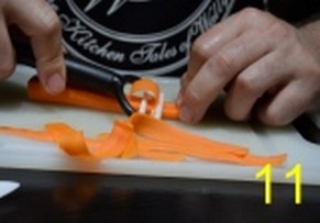 Lavate e mondate il resto delle verdure; tagliate a metà i pomodorini, affettate finemente i rapanelli (10)i cetrioli e metteteli a spurgare , ricavate dei nastri con l'economo con la carota (11). Tagliate a metà le foglie di Belga rossa (12)