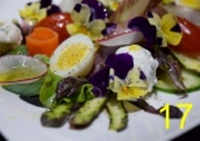 il resto dei vegetali, i gamberi e le uova di quaglia (16), quindi condite il formaggio in una ciotola con l'erba cipollina, il sale ed il pepe e formate delle mezze sfere con lo scavino e ponetele nel piatto. Aggiungete ulteriori asparagi al centro della composizione insieme all'insalata Belga. Terminate con i fiori edibili aggiungete qualche goccia d'olio aromatizzato, pepe di mulinello e servite (17-18).