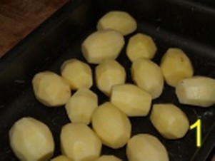 Lavate e pelate le patate, una volta pronte, dategli una forma regolare ad "olivetta" come in figura (1). Lessatele in acqua bollente salata per 5 minuti (2), poi scolatele e asciugatele, quindi conditele per bene con l'olio E.V.O. (3) e passate in forno caldo statico a 200 gradi per trenta minuti.