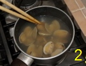 Fate spurgare le vongole in acqua salata per 3-4 ore cambiando l'acqua due volte. Schiacquate e scolatele. Scaldate il wok e mettete le vongole ad aprire (1). Mettete nel brodo bollente lo zenzero, il mirin, la salsa di soia il sale e le vongole aperte (2), fate cuocere per 10 minuti. Servite la minestra bollente, guarnendo con il cipollotto a riccioli (3).
