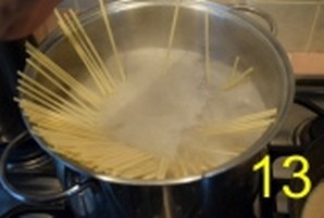 ciotola (9). Filtrate il brodo con un colino cinese (10) e rimettete a bollire sul fuoco. Aggiungete tutto il contenuto della ciotola dentro la padella (11) e cuocete a fiamma viva per 5 minuti, sfumate con il vino bianco, quindi frullate il tutto con il minipimer (12) e togliete dal fuoco. Prendete le linguine e immergetele nel brodo bollente per lessarle (12).