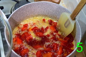 Radunate il peperoncino ed il peperone dentro il tegame, quindi aggiungete lo zucchero ed il sale ed iniziate la cottura (4). Dopo due minuti aggiungete l'acqua (5) e continuate la cottura a fuoco bassissimo per mezzora circa e fino a che l'acqua non evapori completamente (rimarrà una piccola quantità di sciroppo). A questo punto potete frullare a bassa velocità con il minipimer o con il frullatore fino ad ottenere una consistenza non troppo omogenea (6) ma legata e cremosa.