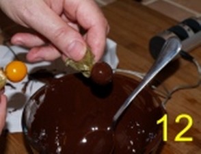riunite tutto il cioccolato nella pentola iniziate (10). In questa maniera la temperatura finale dovra arrivare a 32 gradi. Estraete i semifreddi dal freezer e deponeteli uno alla una ciotola, quindi volta sulla gratella. Versate immediatamente il cioccolato a "coprire" (11), quindi riponete immediatamente nel freezer. Una volta fatti tutti, preparate le decorazioni; utilizzando un cornetto da decorazione, realizzate sulla carta forno arrotolata su di una bottiglia, delle foglie di cioccolato e ricoprite gli alchechengi immergendoli nella bowl (12). Lasciate raffreddare per bene quindi servite preparando una salsa al cioccolato calda con il 40 % (rapporto peso/peso) di acqua e accompagnate con panna montata con cacao in polvere sopra.