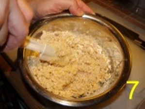 Versate in uno stampo in silicone, eliminando gli eccessi con una spatola (10) e mettete in freezer per una notte. Mettete gli amaretti in un sacchetto da congelatore e schiacciateli con le mani riducendoli in briciole; mettete in una ciotola gli amaretti, aggiungete il burro ammorbidito (11) e impastate per amalgamare il tutto. Quindi ponete il composto tra due strati di carta forno, e dopo averlo pressatelo leggermente, stendetelo con il mattarello; mettetelo in frigorifero a riposare dopo di che coppatelo della misura desiderata (12).