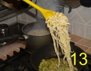 Quando la pasta salirà a galla scolatela direttamente dentro il saltapasta (13) e mantecate il tutto; servite immediatamente nei piatti e cospargete con abbondante tartufo bianco a lamelle.