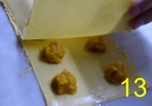 Tirate la seconda sfoglia e sovrapponetela alla prima (13). Sigillate con le mani la pasta facendo uscire tutta l'aria (14), quindi con la rotella rifilate i bordi, tagliate i tortelli (15) e metteteli sul vassoio per pasta spolverato si farina. Ripetete i passi dall'11 al 15 fino a terminare l'impasto. nel frattempo mettete a bollire la pentola con l'acqua, prendete la padella e sciogliete il burro; quando