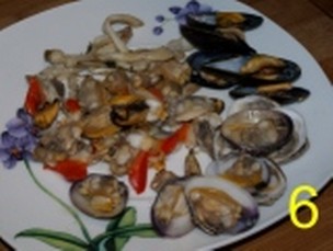 Man mano che si apriranno e con l'aiuto di una pinza estraete le conchiglie (4) che si apriranno (eseguite questa operazione in maniera veloce non devono cucinare molto). Filtrate l'acqua rimasta in una ciotola (5), quindi eliminate il 70% dei gusci tenendone la rimanenza assortita per la presentazione del piatto (6).